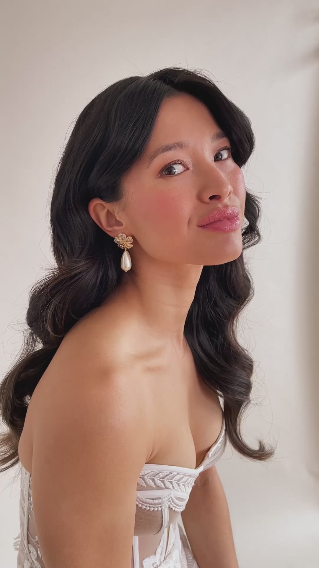 Beautiful statement flower wedding earrings. High quality 14k gold plated brass finish with a faux pearl and cubic zirconia stones.